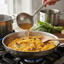 Zmniejsz ogień do średnio-niskiego. Zacznij dodawać gorący bulion, po jednej chochelce na raz. Każdą kolejną porcję bulionu dodawaj dopiero wtedy, gdy poprzednia zostanie niemal całkowicie wchłonięta przez ryż. Mieszaj risotto często, ale nie bez przerwy - delikatne, regularne mieszanie uwalnia skrobię i zapobiega przywieraniu. Cały proces gotowania ryżu potrwa około 18-20 minut. Ryż jest gotowy, gdy jest miękki na zewnątrz, ale wciąż lekko twardy w środku (al dente). Risotto powinno mieć płynną, lekko lejącą się konsystencję, przypominającą falę ('all'onda').