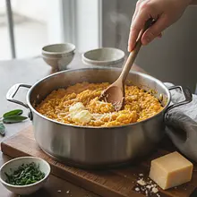 Zdejmij garnek z ognia. To czas na 'mantecaturę' - finałowy krok nadający risotto idealną kremowość. Dodaj pozostałe zimne masło (25g) pokrojone w kostkę oraz świeżo starty ser Parmezan. Energicznie mieszaj risotto przez około minutę, aż masło i ser całkowicie się rozpuszczą, tworząc jedwabistą emulsję. Przykryj garnek i odstaw na 2 minuty, aby smaki się połączyły.