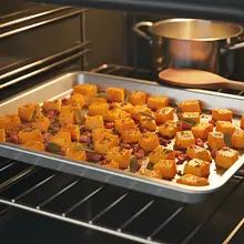 Transfer the chopped pumpkin to a large baking tray lined with parchment paper. Drizzle it with half of the olive oil (about 15g / 1 tablespoon), and sprinkle with salt and pepper. Mix thoroughly with your hands, ensuring each piece of pumpkin is coated with oil and seasonings. Spread the pumpkin in a single layer on the tray.