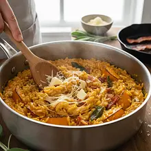 This dish is the essence of autumn captured on a plate. Velvety, creamy risotto, made with Arborio rice, gains a deep, sweet flavor from the roasted hokkaido pumpkin purée. Each bite is a perfect balance of flavors: the sweetness of the pumpkin, the earthy, slightly perfumed aroma of crispy sage, the salty intensity of crunchy bacon, and the nutty note of Parmigiano Reggiano cheese. The dish comes from northern Italy, where risotto is a true culinary art. It is an incredibly hearty and warming dish, perfect for cooler days. Visually, it presents beautifully with its intense orange color, contrasting with the green of the sage and the dark bacon. Serve it as an elegant main course for dinner or a special lunch, preferably accompanied by a glass of dry white wine, the same one used for cooking.