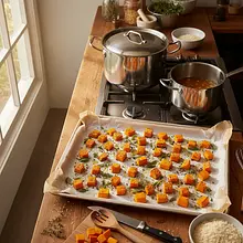 Wyłóż blachę do pieczenia papierem do pieczenia. Rozłóż na niej przyprawioną dynię w jednej warstwie. Wstaw do nagrzanego piekarnika i piecz przez około 25-30 minut, aż dynia będzie miękka i lekko skarmelizowana na brzegach. Możesz sprawdzić jej miękkość, nakłuwając kawałek widelcem – powinien wchodzić bez oporu.