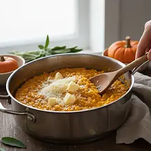 This dish is the essence of autumn captured in a single plate. Creamy, rich-flavored risotto made from Arborio rice envelops sweet, slightly nutty pieces of roasted Hokkaido pumpkin. The aroma of fresh sage, sautéed in butter until crispy, perfectly balances the buttery mildness of the dish, while high-quality Parmesan cheese adds a deep, salty umami flavor. Risotto originates from northern Italy and symbolizes patience in the kitchen, as its preparation requires constant stirring and gradual addition of broth. The result is a dish with an unparalleled, velvety texture that is both hearty and elegant. It is perfect as a main course for an autumn lunch, a romantic dinner, or comfort on a chilly day. Served in a warm, deep plate, garnished with crispy sage leaves and pumpkin seeds, it delights not only with its taste but also with its appearance.