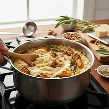 To danie to esencja jesieni zamknięta w jednym talerzu. Kremowe, aksamitne risotto z ryżu Arborio, wzbogacone słodyczą pieczonej dyni hokkaido, tworzy idealną bazę dla głębokich, ziemistych nut. Aromatyczna, lekko chrupiąca szałwia smażona na maśle dodaje niepowtarzalnego charakteru, a prażone orzechy włoskie wprowadzają przyjemną chrupkość i orzechowy posmak. Całość spaja intensywny, słony ser Parmezan, który nadaje potrawie głębi umami. Danie pochodzi z północnych Włoch, gdzie risotto jest kulinarną dumą. Podawane jako eleganckie danie główne (primo piatto), doskonale komponuje się z kieliszkiem wytrawnego, białego wina. Jego piękny, złocisto-pomarańczowy kolor i bogactwo tekstur sprawiają, że jest to potrawa nie tylko pyszna, ale i niezwykle apetyczna wizualnie, idealna na chłodniejsze dni.