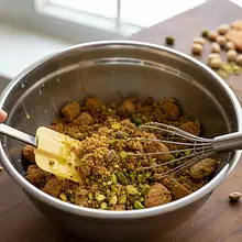 In a bowl with crushed cookies, add chopped pistachios and pour in the melted butter. Mix everything thoroughly with a spoon until the ingredients combine and achieve the consistency of wet sand. Transfer the mixture to the prepared springform pan, spread it evenly, and press it firmly to the bottom using the bottom of a glass or a spoon. Place the springform pan in the refrigerator for at least 30 minutes to allow the base to set.