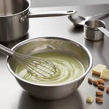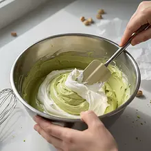 Add the whipped cream to the prepared cheese-pistachio mixture. Do this in two or three batches. Use a silicone spatula and gently fold the cream into the mixture, making circular motions from the bottom of the bowl upwards. Mix only until the ingredients are combined. The goal is to retain as much air as possible from the whipped cream.