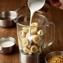 If you don't have frozen bananas already: peel very ripe bananas (with brown spots on the skin), slice them into pieces about 1–1.5 cm thick, and spread them in a single layer on a baking sheet lined with parchment paper. Place in the freezer for at least 4 hours, preferably overnight. If the bananas are already frozen, take them out 5–10 minutes before blending to soften slightly - they should be very cold but not permanently solid.