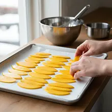 Prepare a large, flat baking sheet or tray and line it with parchment paper. Spread the chopped mango pieces in a single layer, making sure they do not touch each other. Place the tray in the freezer for at least 4 hours, preferably overnight. The pieces must be completely frozen, hard as a rock.