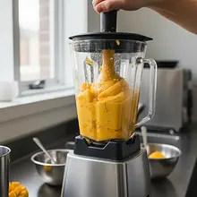 Start blending on low speed, using a tamper if your blender has one, to push the fruit down to the blades. Initially, the mango will turn into a fluffy, fruity 'snow'. Don't stop working! Continue blending, gradually increasing the speed. Occasionally stop the blender and scrape down the mixture from the sides with a silicone spatula. After 3-5 minutes, the mixture will start to become smooth and creamy. At this point, if you wish, add the optional lime juice and maple syrup. Blend for a little longer until the ingredients are perfectly combined.