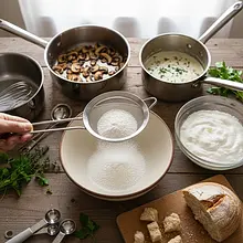 In a small bowl, combine 200 ml of 30% cream with 1 tablespoon (15g) of all-purpose flour. Using a small whisk or fork, mix vigorously until you achieve a smooth mixture without any lumps. Add one ladle of hot mushroom sauce to the bowl with the cream and mix again – this will temper the cream and prevent it from curdling. Then pour the entire contents of the bowl into the pot with the mushrooms, continuously stirring the sauce with a whisk. Cook on low heat for another 3-5 minutes, until the sauce noticeably thickens.