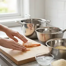 Jeśli używasz mrożonych krewetek, upewnij się, że są całkowicie rozmrożone. Najlepiej przełożyć je z zamrażarki do lodówki na kilka godzin. Następnie każdą krewetkę należy oczyścić. Ostrym, małym nożykiem natnij grzbiet krewetki na całej długości, od głowy do ogona, na głębokość około 2-3 mm. Zobaczysz ciemną nitkę – to jelito. Usuń je delikatnie za pomocą czubka noża lub wykałaczki. Opłucz krewetki pod zimną wodą i osusz bardzo dokładnie papierowym ręcznikiem. Wilgotne krewetki sprawią, że panierka będzie odpadać.