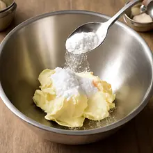 In a large bowl, place softened butter (200 g) and powdered sugar (80 g) along with vanilla sugar (8 g). Using a hand mixer or a stand mixer with a mixing attachment, beat on medium speed for 2–3 minutes until the mixture becomes lighter and fluffy. The mixture should be smooth and slightly creamy; if mixing by hand, use a wooden spoon and stir vigorously for about 4-5 minutes.
