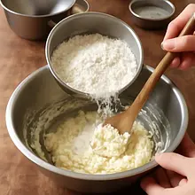 In a separate bowl, sift the all-purpose flour (300 g), potato starch (40 g), baking powder (5 g), and a pinch of salt (1 g). Mix the dry ingredients with a fork to evenly distribute the baking powder.