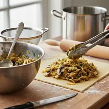Cabbage and mushroom pastries are an absolute classic of Polish cuisine, an inseparable element of the Christmas Eve table, traditionally served with clear, rich red borscht. This recipe is a tribute to tradition in a modern, refined version. The secret is the half-puff pastry, which, thanks to the technique of cutting cold fat into the flour and gentle folding, achieves an extraordinary, flaky structure. It is wonderfully buttery, crispy, and melts in your mouth, while being much simpler to prepare than classic puff pastry. The filling is the essence of flavor – intensely mushroomy thanks to dried porcini, with perfectly balanced acidity from sauerkraut, complemented by the sweetness of slowly sautéed onions. The whole is seasoned with marjoram, which adds herbal depth. Visually, the pastries look incredibly appetizing – small, neat rectangles with a golden-brown, glossy crust from the egg yolk, often sprinkled with caraway seeds or black cumin. This dish creates the atmosphere of holidays and family gatherings.