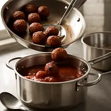 Transfer the browned meatballs to a pot with the simmering sauce (you can reduce the amount of sauce if there's too much). Gently stir so that each meatball is coated in sauce. Cover the pot and simmer on very low heat for 8-10 minutes — the meatballs should be hot and juicy inside.