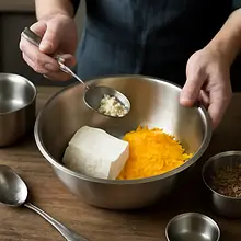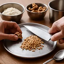 Prepare your workspace: take the cheeses out of the fridge to soften slightly (about 10–15 minutes). Prepare a cutting board, a sharp knife, a cheese grater, two bowls (one larger for mixing, one smaller for breading), a tablespoon or a small teaspoon for portioning, and a tray lined with baking paper. Set the oven or skillet for toasting nuts.