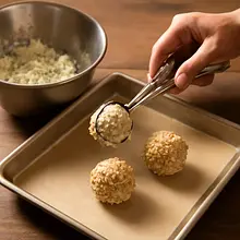 Prepare a tray lined with parchment paper. Take the mixture out of the fridge. Use an ice cream scoop or a tablespoon (about 20–25 g per ball) — scoop a portion, transfer it to your hand, and with energetic but gentle movements of your hands, shape it into a ball about 2.5–3 cm in diameter. Frequently wet your hands with cold water to prevent the mixture from sticking to your hands. Place the formed balls on the tray.