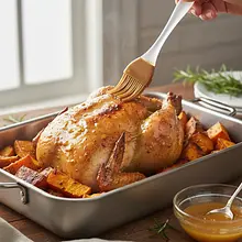 Po 20 minutach pieczenia ostrożnie wyjmij blachę z piekarnika. Używając pędzelka, posmaruj wierzch każdej piersi kurczaka pozostałą 1/3 glazury. Wstaw blachę z powrotem do piekarnika i piecz przez kolejne 15-20 minut. Danie jest gotowe, gdy kurczak jest w pełni upieczony (po przekrojeniu w najgrubszym miejscu soki są przezroczyste, a mięso białe) i pięknie skarmelizowany, a bataty są miękkie i lekko przypieczone na brzegach.