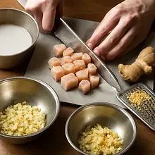 Cut the chicken into cubes. Peel the ginger and grate it, finely chop the garlic.