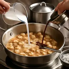 Pour the coconut milk and soy sauce into the pan. Mix well and cook over medium heat for 15 minutes, until the sauce thickens.