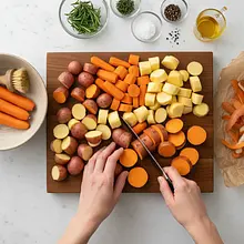 Wash the carrot, parsnip, and potatoes thoroughly and peel them using a vegetable peeler. Cut them into pieces of similar size - for example, into thick sticks or cubes with a side of about 2-3 cm. Peel the red onion and cut it into wedges. Ensuring uniform size of the pieces is key so that all the vegetables roast at the same time.