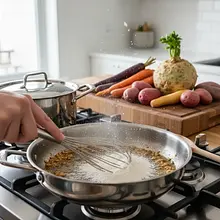 In a pan with garlic, add a tablespoon of wheat flour. Whisk vigorously for about a minute to create a smooth paste called a roux. This is the base that will thicken the sauce. Then, while continuously stirring with the whisk, slowly start pouring in the broth. Initially, pour in just a little and mix to break up any lumps, then add the rest in a thin stream. Cook on low heat, stirring, until the sauce thickens, which will take about 2-3 minutes.