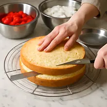 Cut the cooled sponge cake horizontally into two equal layers using a sharp serrated knife or cake wire. Place the bottom part on a cake stand. Use a brush to evenly soak the sponge with syrup (about 2-3 tablespoons of syrup per layer — don't overdo it to avoid making the cake soggy).