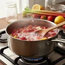 In a medium-sized pot (with a capacity of about 2-3 liters), place the chopped rhubarb, strawberries (whole or halved if they are large), sugar, cinnamon stick, and star anise. Pour in 500 ml of water and gently stir with a wooden spoon to help the sugar start dissolving.