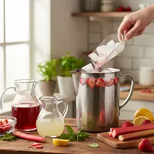 Prepare a large glass pitcher with a capacity of at least 2 liters. Pour in the entire chilled rhubarb-strawberry syrup and freshly squeezed lemon juice. Mix everything thoroughly with a long spoon to combine the flavors. At this stage, you have the base for the lemonade.