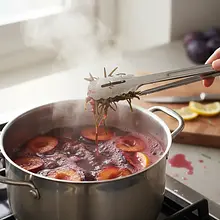 Remove the pot from the heat. Using tongs or a fork, carefully remove the sprigs of rosemary, cinnamon stick, and star anise. Let the syrup sit for about 10-15 minutes to cool slightly. Set a fine mesh strainer over a clean bowl or pitcher. Pour the contents of the pot into the strainer. Using the back of a large spoon or a silicone spatula, press the cooked plums through the strainer to extract as much juice and pulp as possible. Discard the skins and remaining pulp left in the strainer. Set the smooth syrup aside to cool completely.