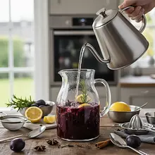Slowly pour 750 ml of cold water into the jug with the plum-lemon base. You can use still water for a classic lemonade or very chilled sparkling water to give the drink refreshing bubbles. If you are using sparkling water, pour it down the side of the jug to avoid losing too much carbonation. After pouring in the water, gently stir the mixture with a long spoon, making only a few movements to combine the ingredients, but do not 'knock out' the bubbles.