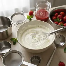 Połącz krem z bitą śmietaną. Do miski z masą mascarpone dodaj 1/3 ubitej śmietany i delikatnie wymieszaj szpatułką, aby rozluźnić masę. Następnie dodaj pozostałą bitą śmietanę i połącz całość bardzo delikatnymi, kolistymi ruchami od dołu do góry, aby zachować jak najwięcej powietrza. Gotowy krem powinien być puszysty i jednolity.