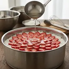 Ułóż owoce i wylej galaretkę. Pozostałe 200g truskawek umyj, osusz, usuń szypułki i pokrój w plasterki o grubości ok. 3-4 mm. Wyjmij formę ze stężałym musem z lodówki. Delikatnie ułóż plasterki truskawek na powierzchni musu, tworząc dekoracyjny wzór. Bardzo powoli, najlepiej łyżką, wylej zimną galaretkę na owoce. Rób to ostrożnie, aby nie poruszyć owoców i nie uszkodzić musu.