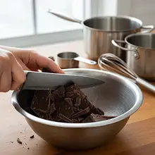 In a metal or glass bowl, place the broken dark chocolate into small pieces and the diced butter. Melt the ingredients in a water bath – place the bowl over a pot of gently boiling water, ensuring the bottom of the bowl does not touch the water. Stir occasionally until the mixture is smooth and shiny. Remove from heat and let it sit for 5 minutes to cool slightly.