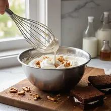 While the cookies are cooling, prepare the whipped cream. In a large, chilled bowl, place very cold heavy cream. Whip it with a mixer on high speed until it becomes thick and stiff. Properly whipped cream should form 'stiff peaks', meaning that when you remove the mixer beaters, the peaks formed on them do not fall.