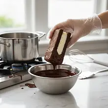 Arrange the assembled sandwiches on a tray lined with baking paper and place in the freezer for at least 1 hour. This step is very important – the sandwiches must be very firm and frozen so that the chocolate coating sets on them immediately.