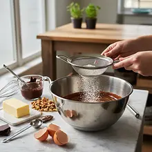 Sift 40g of all-purpose flour and a pinch of salt into the egg-chocolate mixture through a fine sieve. Using a silicone spatula, very gently fold the flour into the mixture, making motions from the bottom of the bowl upwards. Mix only until no dry flour is visible. Pour the batter into the prepared pan and smooth the top. Bake for 20-22 minutes. The brownie is ready when the edges are set and the center is still slightly moist (a toothpick inserted should come out coated with wet crumbs, not raw batter). Let it cool completely in the pan, then cut into small cubes (about 1x1 cm).