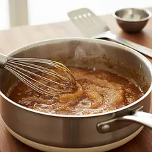 In a saucepan with a thick, light-colored bottom, place 150g of sugar and spread it evenly. Heat over medium heat without stirring until the sugar at the edges starts to melt. Then you can gently move the saucepan to allow the melting sugar to cover the rest of the crystals. Once all the sugar has dissolved and has a beautiful amber color, immediately remove it from the heat. Add 50g of diced butter and vigorously mix with a whisk (be careful, it will splatter a lot!).