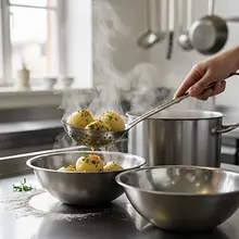 The name 'iron dumplings' comes from the fact that after cooling, they become very hard, like iron. It was a typical dish for Łódź workers – cheap, filling, and simple to prepare. They were often served fried the next day, which restored their softness.