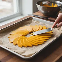 Prepare a large, flat tray or baking sheet and line it with parchment paper. Arrange the cut mango pieces on the tray in a single layer, making sure they do not touch each other. Place the tray in the freezer for at least 4 hours, preferably overnight. The pieces must be as hard as a rock.