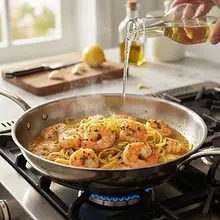 Potrawy w stylu 'aglio, olio e peperoncino' (czosnek, oliwa i chili) to klasyka włoskiej 'cucina povera' (kuchni biednych), gdzie z kilku prostych, ale wysokiej jakości składników tworzy się niezwykle smaczne dania. Dodanie krewetek i wina przekształca ten prosty posiłek w danie godne królewskiego stołu.