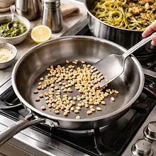 Toast the pine nuts: heat a dry, non-stick skillet over medium heat. Add the nuts and stir with a wooden spoon for 2-3 minutes, until they start to brown slightly and release their aroma. Be careful, as they can burn quickly — remove from heat and transfer to a bowl to cool. In a blender or mortar, place the basil leaves (without large stems), cooled pine nuts, grated Parmesan, and garlic. Start blending/pounding briefly, gradually pouring in the olive oil in a thin stream (about 60 ml from the prepared 95 ml) and adding lemon juice. Blend for 30-60 seconds until you achieve a smooth but still slightly grainy emulsion. Season with 1-2 grams of salt and a pinch of pepper (to taste). If the pesto is too thick, add 1-2 tablespoons (15-30 ml) of pasta cooking water later to thin it out.