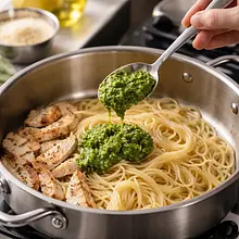 Pesto: in the fridge for up to 3 days in an airtight jar with a layer of oil on top; in the freezer for up to 3 months (in portions). Prepared dish: in an airtight container in the fridge for up to 48 hours. To reheat — use a pan over low heat and add 1-2 tablespoons of cooking water or oil to restore creaminess; avoid the microwave, which can dry out the chicken.