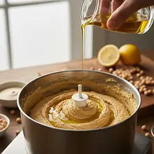 Gdy pasta jest już gładka, ale wciąż bardzo gęsta, włącz blender na niskie obroty i powoli, cienką strużką, wlewaj lodowatą wodę. Dodawaj wodę stopniowo, obserwując konsystencję hummusu. Kontynuuj miksowanie przez kolejne 1-2 minuty, aż hummus stanie się wyraźnie jaśniejszy, puszysty i osiągnie pożądaną, kremową gęstość.