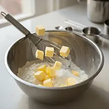 Take the butter straight from the fridge, cut it into small cubes (about 1x1 cm) and add it to the dry ingredients. Now the most important part: with your fingertips, quickly rub the butter into the flour and sugar. Make movements similar to rubbing until clumps resembling wet sand form. Do not knead for too long to prevent the butter from melting. Place the finished crumble in the fridge while you prepare the rest of the dough.