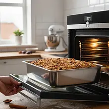 Place the pan in the preheated oven at 180°C and bake for about 50-60 minutes. After about 45 minutes, check the cake with a wooden skewer (e.g., for kebabs). Insert it into the center of the cake, in a spot without fruit. If the skewer comes out dry and without traces of raw batter, the bake is ready. The crumble should be beautifully golden brown.