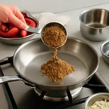 Heat a medium skillet (preferably 24-26 cm in diameter) over medium heat. Add brown sugar (80 g) and melt it for 1-2 minutes, stirring with a wooden spatula until it starts to melt and takes on a golden-brown color. Do not let it burn — as soon as the sugar begins to brown, immediately add the prepared plums.