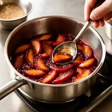Sauté the plums with sugar over medium heat for 3-4 minutes, until the fruit softens, releases juice, and a thick, glossy sauce forms. Finally, sprinkle with cinnamon (2 teaspoons) and mix for 15 seconds. Remove the pan from the heat and let the plums cool slightly (about 10 minutes).