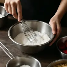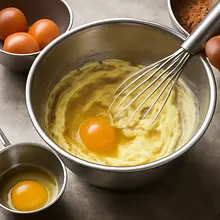 In a separate bowl, mix the wheat flour (380 g), baking powder (12 g), and salt (3 g). Sift the dry ingredients into the wet ones and mix briefly on the lowest speed or stir with a spatula until the ingredients are combined — do not mix for too long. Finally, gradually pour in the milk (120 ml) and gently mix to obtain a smooth, pourable batter with the consistency of thick cream.