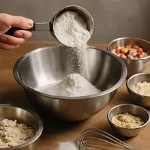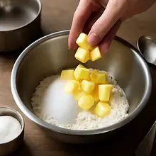 Prepare the crumble: in a bowl, combine 80 g of flour, 50 g of sugar, and 60 g of cold butter cut into cubes. Rub the butter with your fingers into the dry ingredients until pea-sized clumps form and the flour is evenly coated. Finally, mix in 30 g of almond flakes (optional) — they will add crunch.