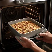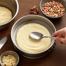 Place the pan in the preheated oven and bake at 180°C for 40–50 minutes. After 35 minutes, check the cake every 5 minutes with a toothpick: insert a dry, thin stick (e.g., a toothpick) into the center — it should come out with a few moist crumbs, but not with raw batter. If the top browns too quickly, loosely cover it with aluminum foil.